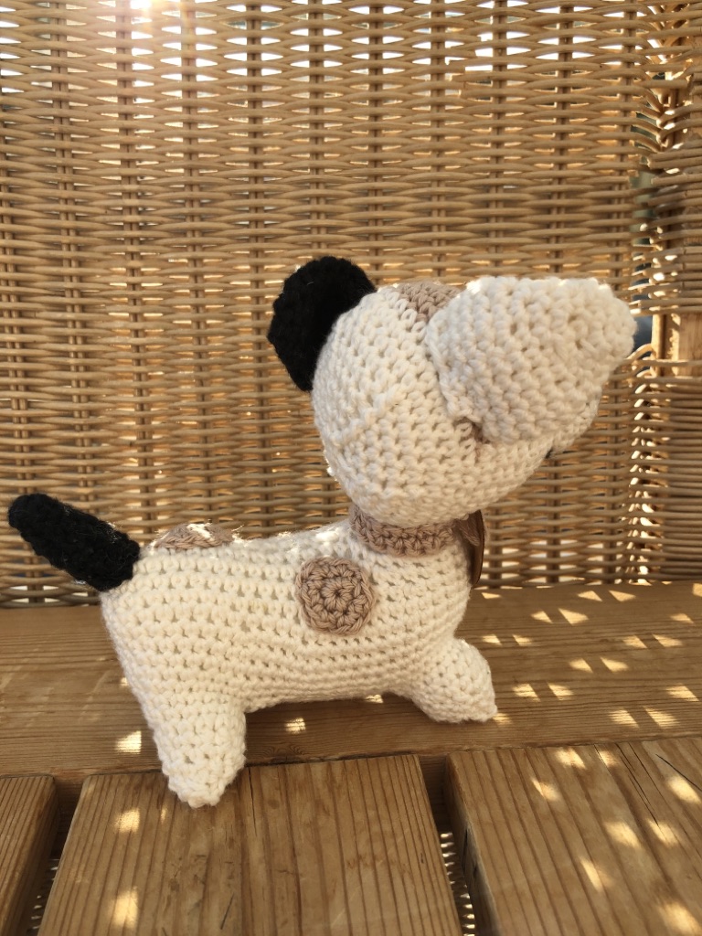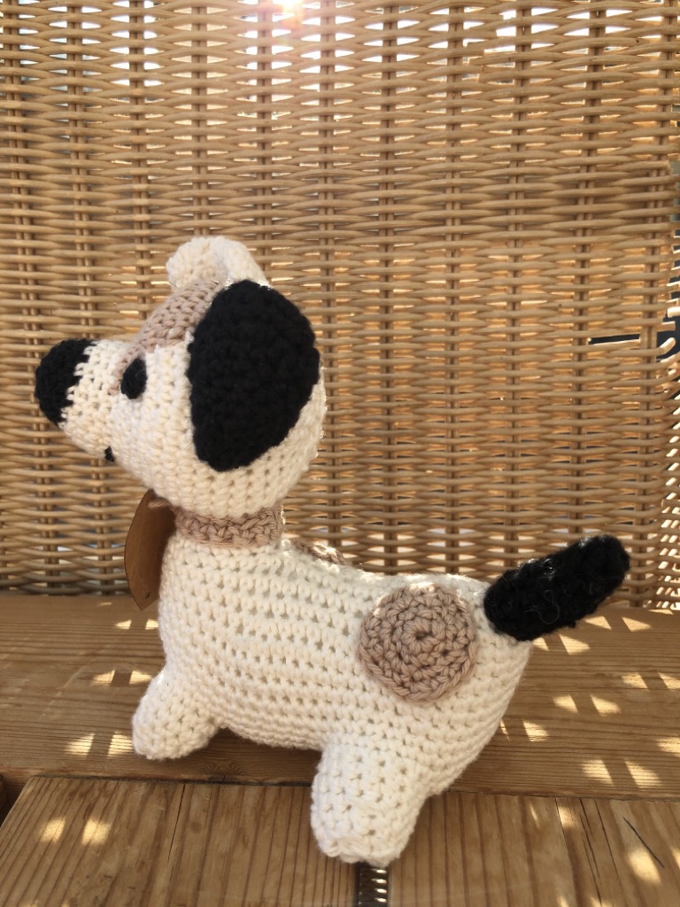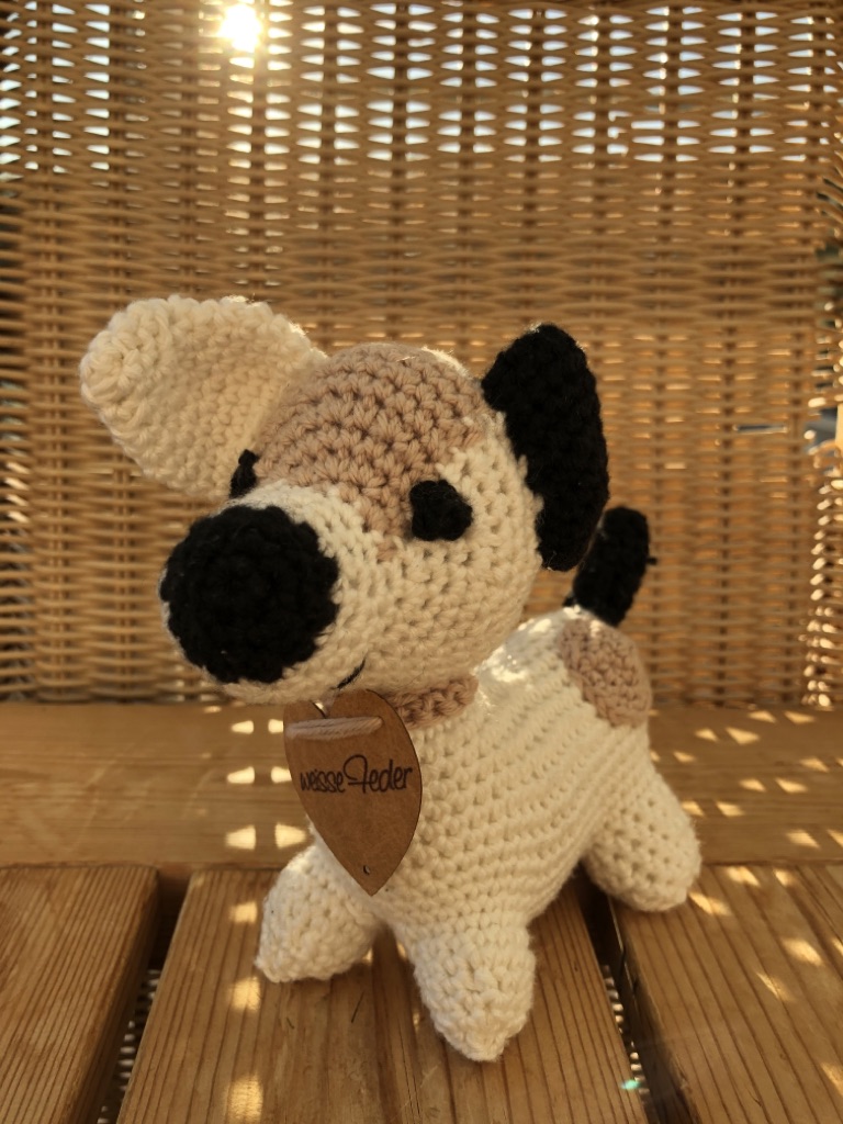 Das Häkeltier Jack Russle ist 15 cm groß und begeistert mit vielen Details. Das Kuscheltier ist in liebevoller Handarbeit gefertigt worden. Ein treuer Wegbegleiter von Geburt an.