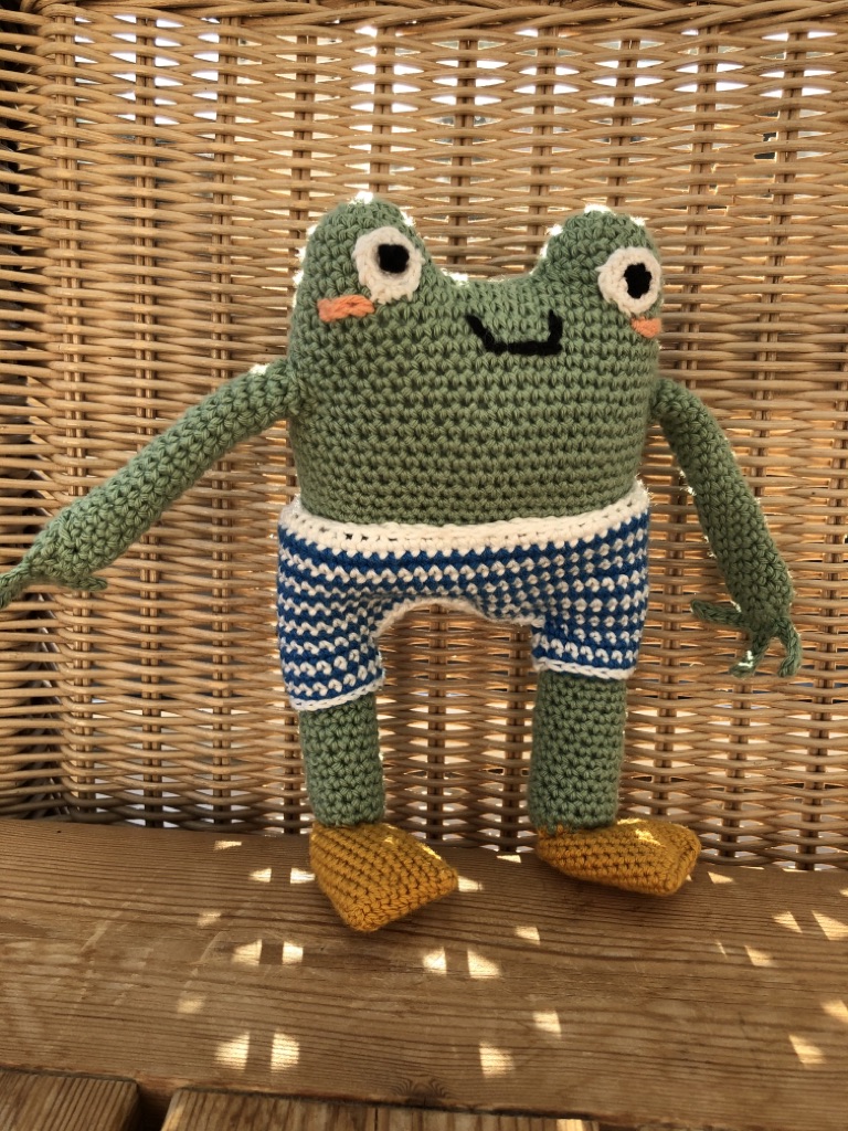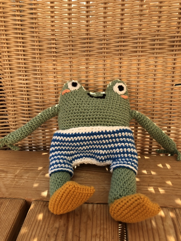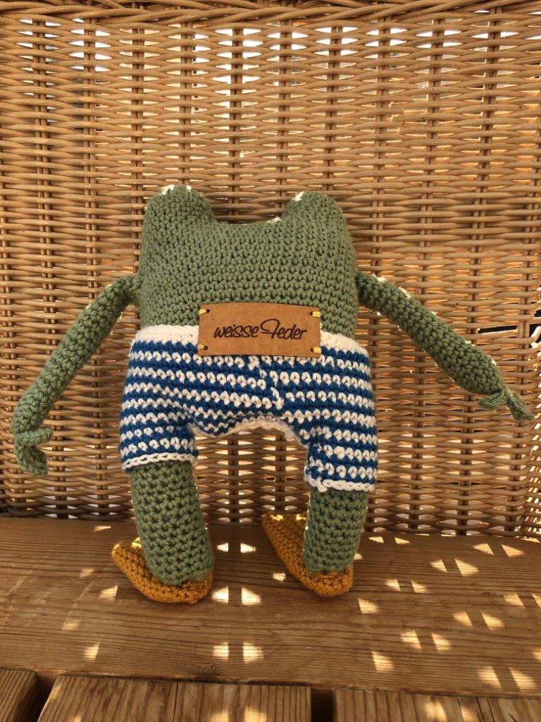 Frosch Viktor wurde wie alle unsere Häkeltiere ohne Knöpfe und ähnliche Kleinteile, welche verschluckt werden könnten gefertigt.