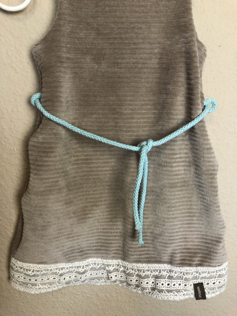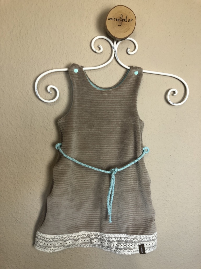 Bequemes Kleid mit Taillenband. Wird mit praktischen Druckknöpfen an den Schultern verschlossen.