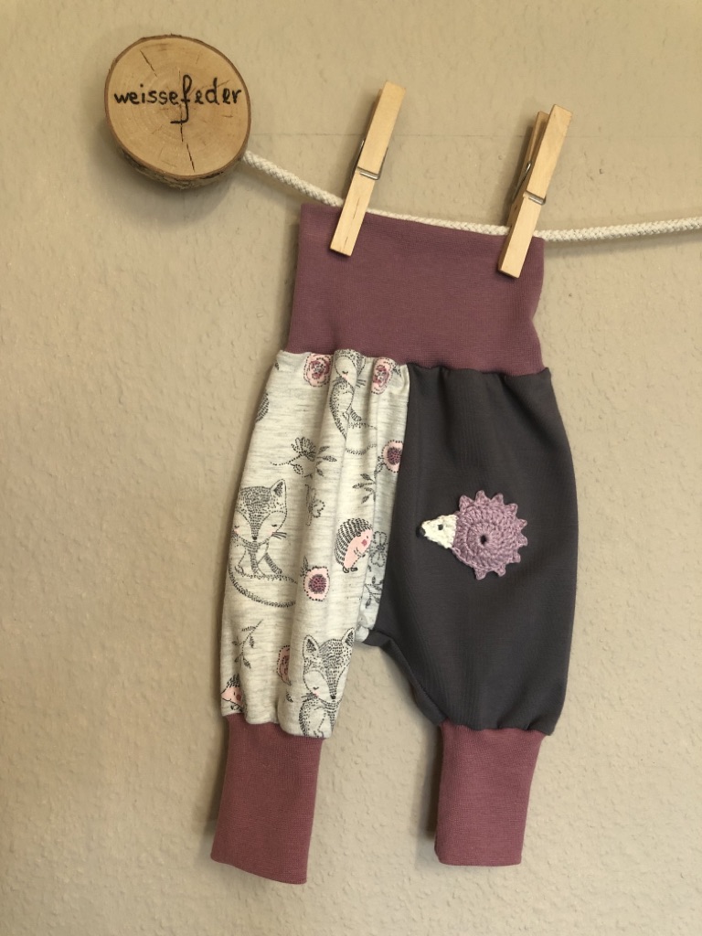 Babyhose, Pumphose Eleonora mit Häkel-Igel.