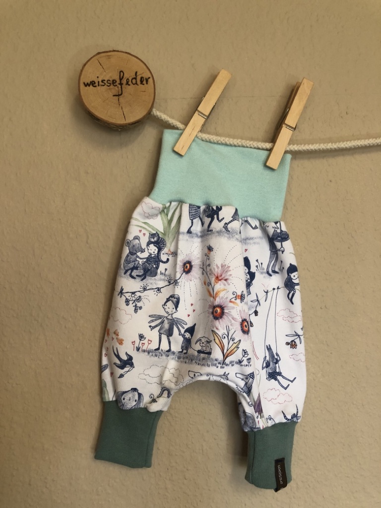 Geschnitten ist die Hose im pumpigen Design. Die Pumphose bietet einen angenehmen Tragekomfort und genügend Platz zum stampeln, dank des bequemen Schnittes. Die Hose hat ein extra breites Bündchen was für den bequemen halt sorgt und nicht einschnürt. Die Pumphose gibt es in zwei praktischen Mitwachsgrößen. Für die kleinere Größe können einfach die Beinbünchen umgeschlagen werden.