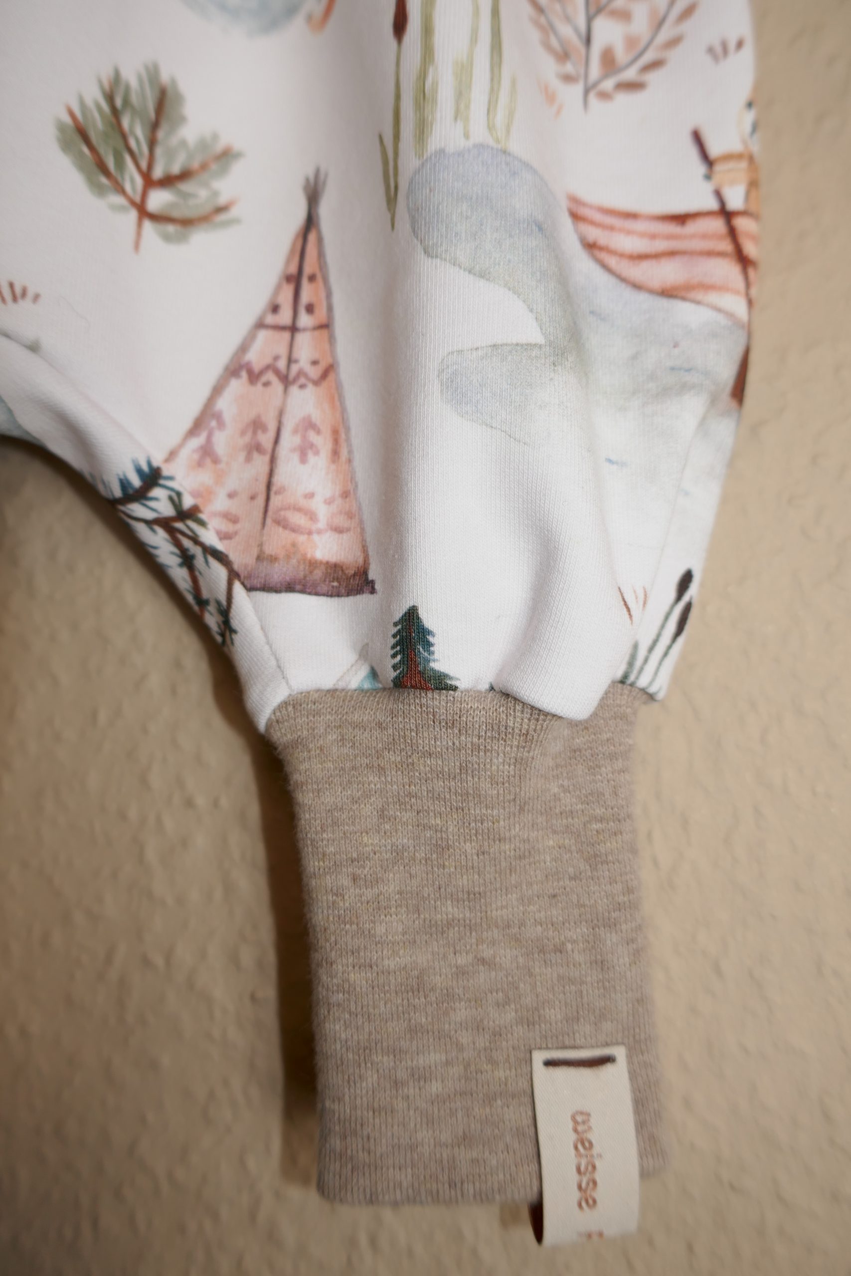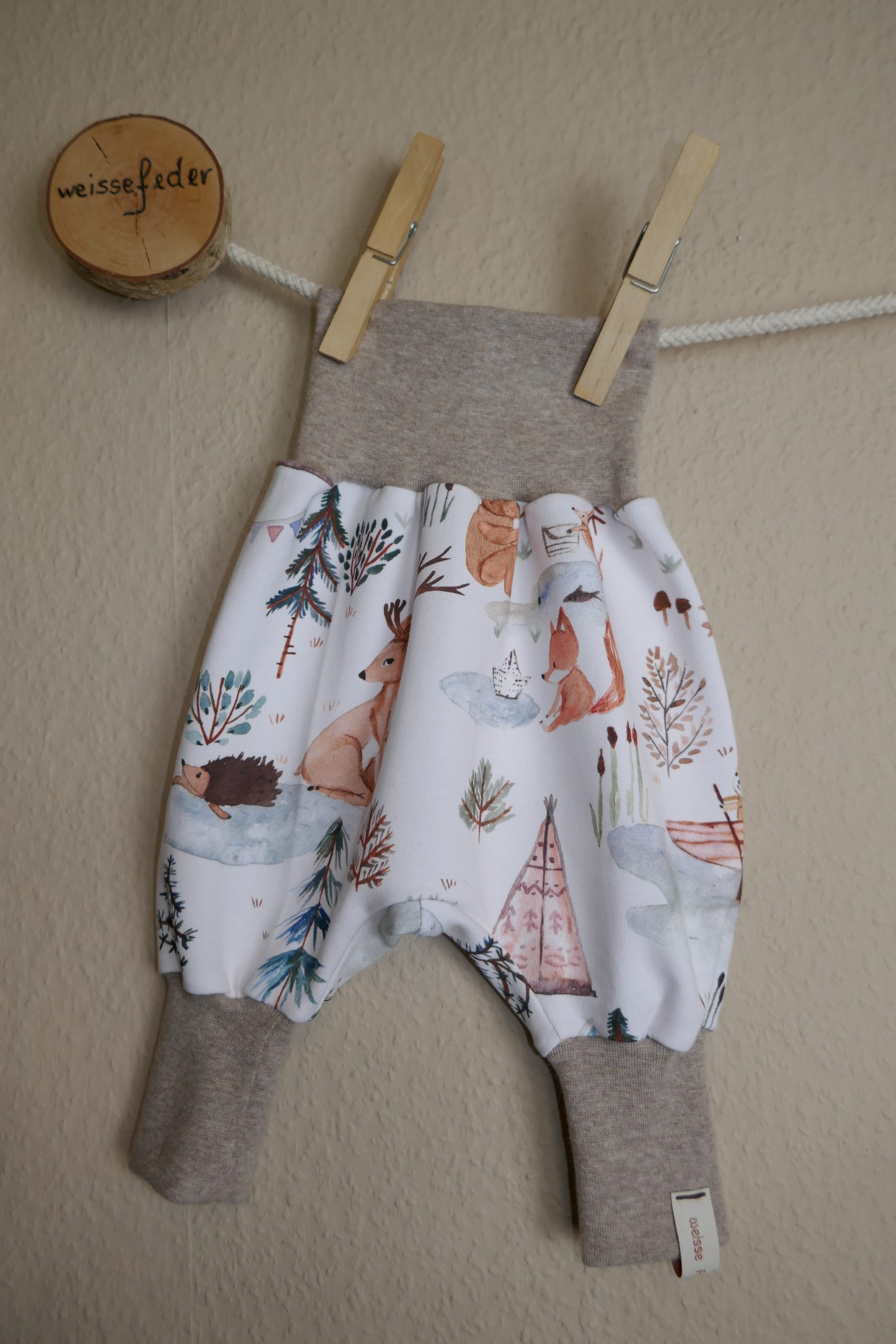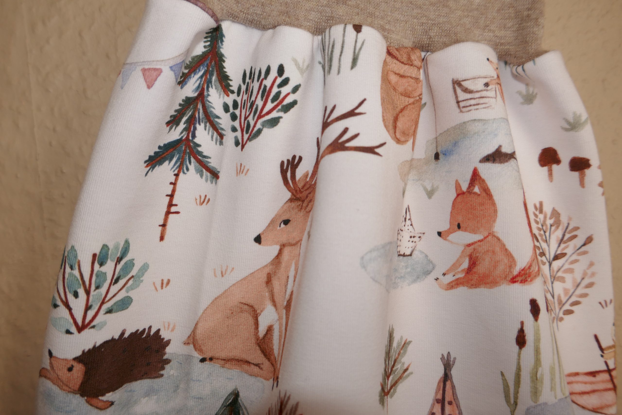 Geschnitten ist die Hose im pumpigen Design. Die Pumphose bietet einen angenehmen Tragekomfort und genügend Platz zum stampeln, dank des bequemen Schnittes. Die Hose hat ein extra breites Bündchen was für den bequemen halt sorgt und nicht einschnürt. Die Pumphose gibt es in zwei praktischen Mitwachsgrößen. Für die kleinere Größe können einfach die Beinbünchen umgeschlagen werden.