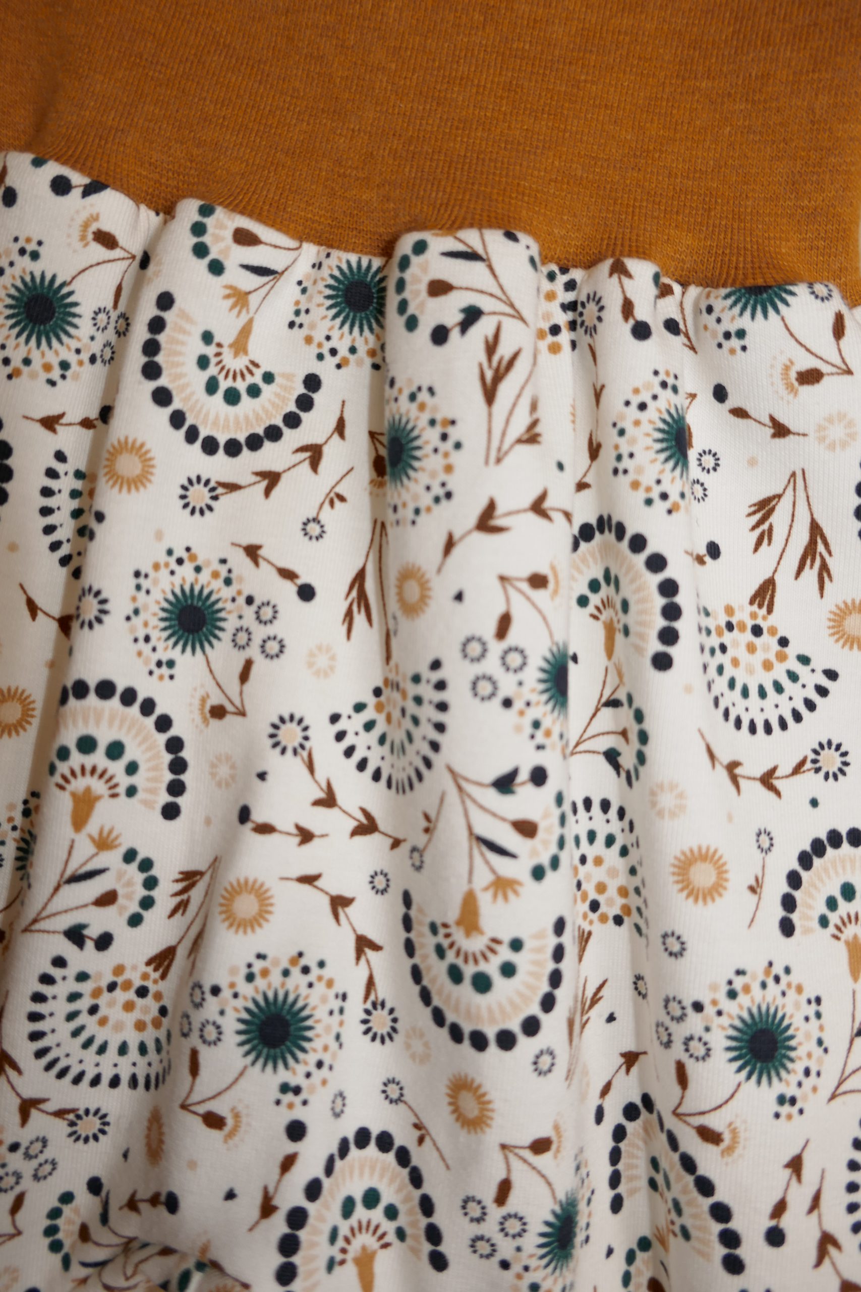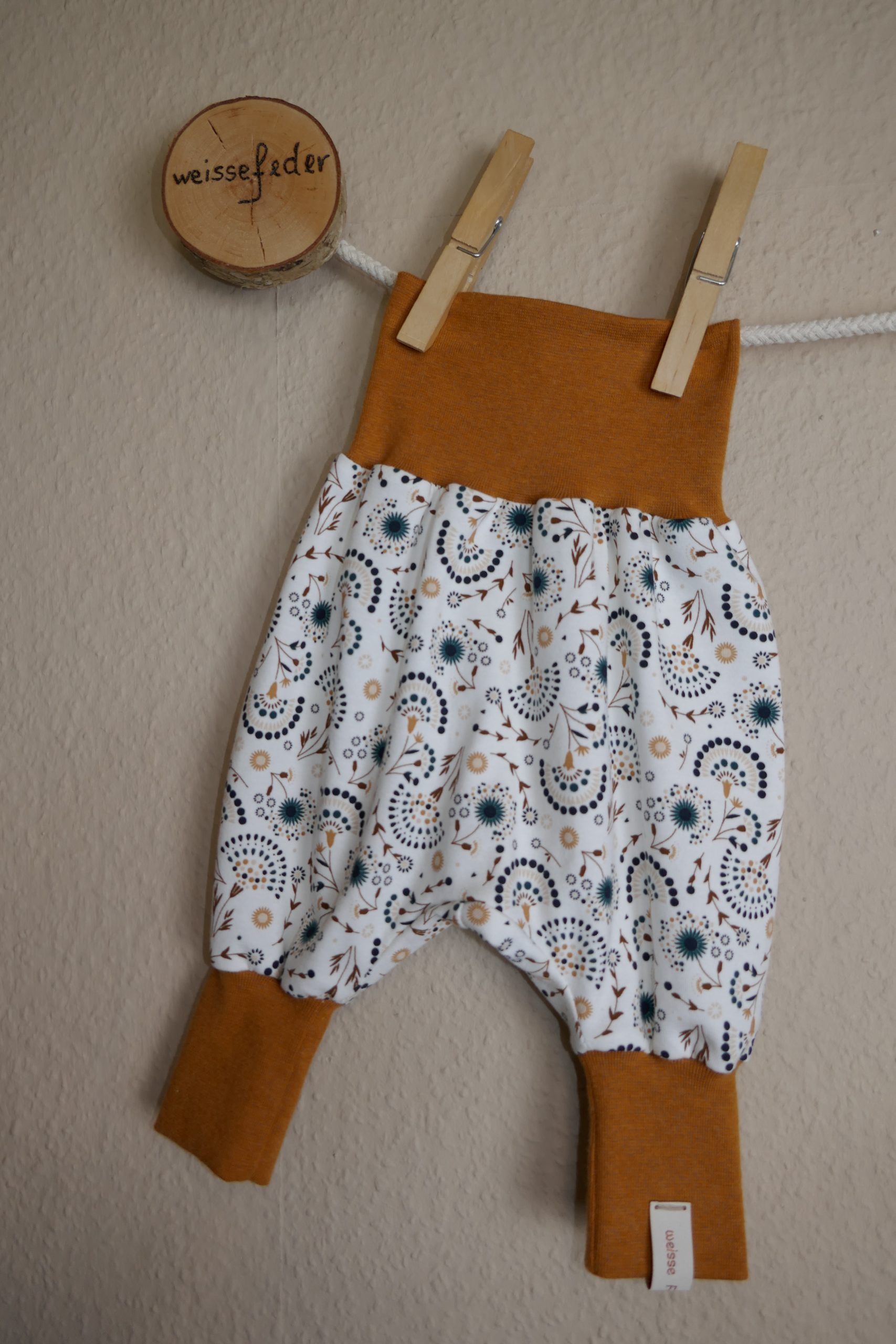 Geschnitten ist die Hose im pumpigen Design. Die Pumphose bietet einen angenehmen Tragekomfort und genügend Platz zum stampeln, dank des bequemen Schnittes. Die Hose hat ein extra breites Bündchen was für den bequemen halt sorgt und nicht einschnürt. Die Pumphose gibt es in zwei praktischen Mitwachsgrößen. Für die kleinere Größe können einfach die Beinbünchen umgeschlagen werden.