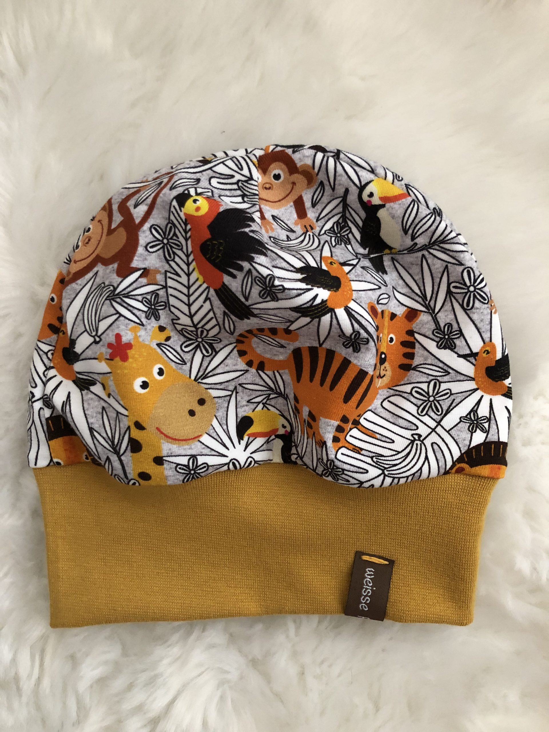 Die Pumphose ist eine Mitwachshose durch langes Beinbündchen. Das Bündchen kann anfänglich umgeschlagen werden.