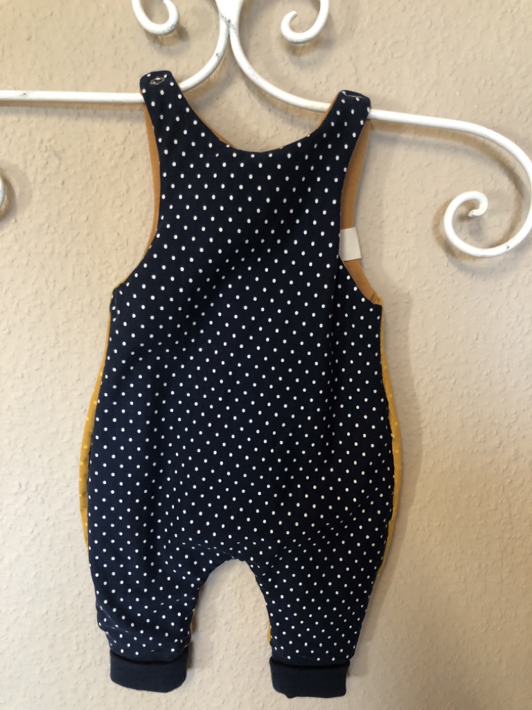 Bequemer Strampler. Wird mit praktischen Druckknöpfen an den Schultern verschlossen.